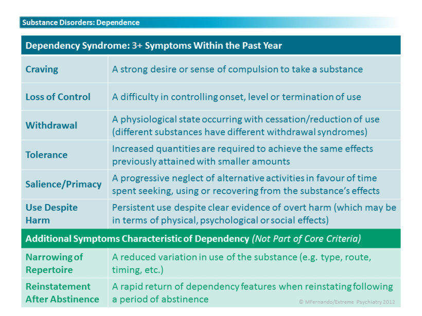 In order to meet a diagnosis of dependency on a given substance, at least three of the first six criteria should have been present over the past 12 months (ICD-10 criteria). But dependency is not the only substance misuse disorder: think for example about the person who is causing harm to themselves through recurrent binge drinking of alcohol. They might have a diagnosis of harmful use of alcohol.